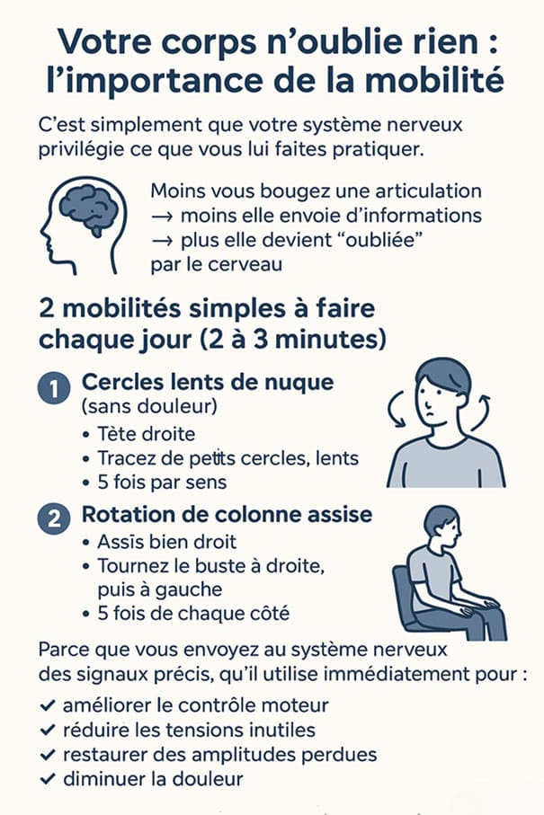 Votre cerveau réagit immédiatement lorsque vous lui redonnez des mouvements précis et contrôlés.📝 Deux mobilités simples à faire chaque jour (2 à 3 minutes)