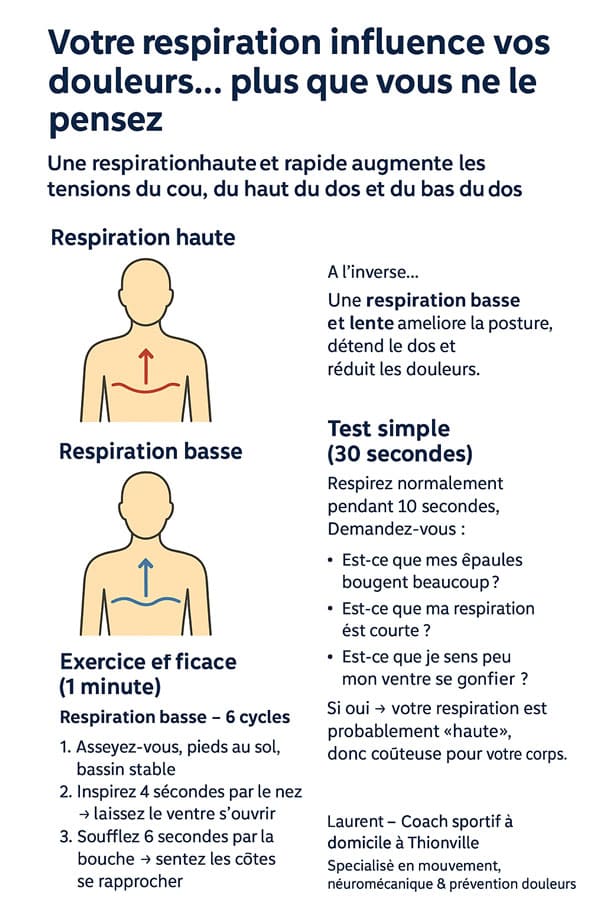 Une respiration haute et rapide augmente les tensions au niveau du cou, du haut du dos et des lombaires.